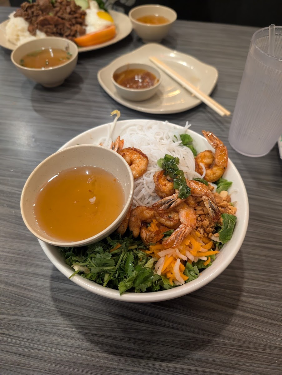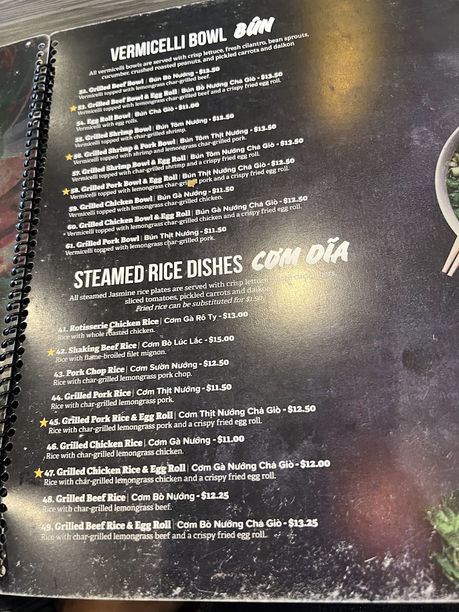 For the main course, the restaurant shines with its pho—a beloved Vietnamese soup that warms the heart. Diners rave about their selections, including the Shaking Beef (Cơm Bò Lúc Lắc), featuring flame-broiled filet mignon served over fluffy steamed rice for just $15.00. And don't overlook the Pork Chop Rice (Cơm Sườn Nướng Sả), where a chargrilled lemongrass pork chop meets a citrus-hint of flavor that is utterly irresistible at $12.50.